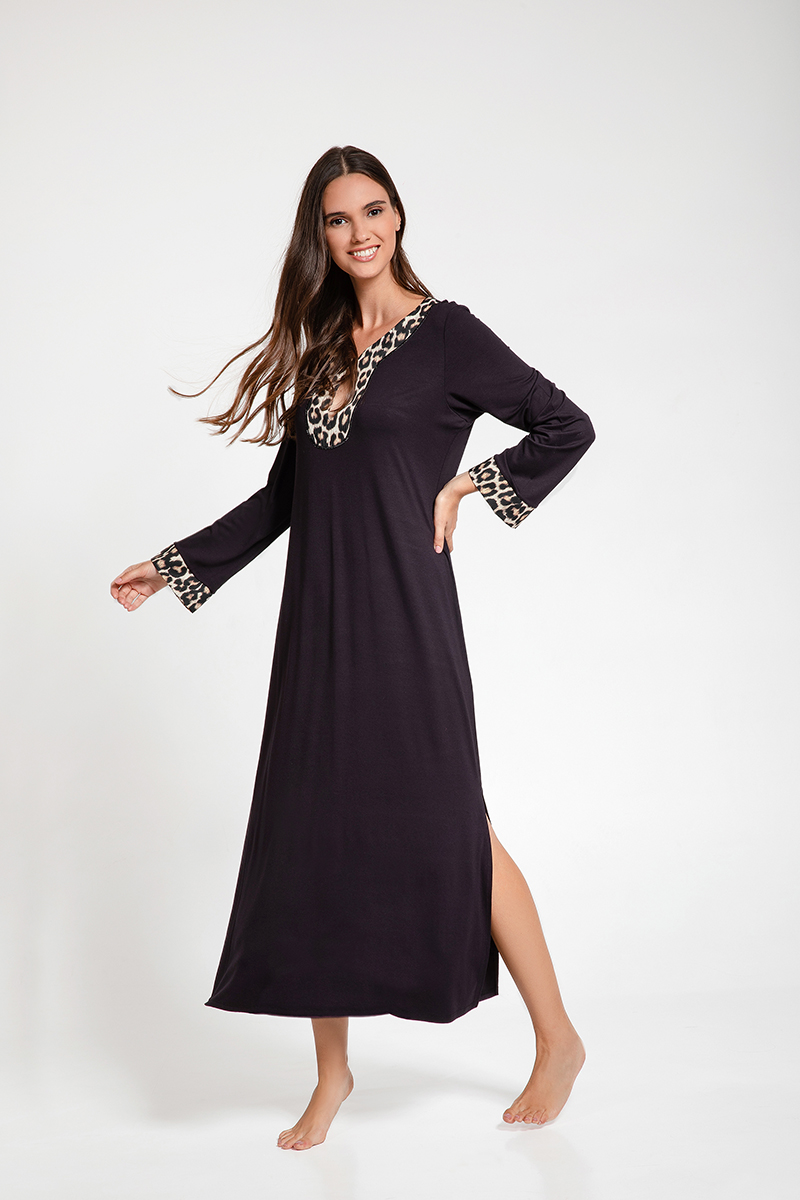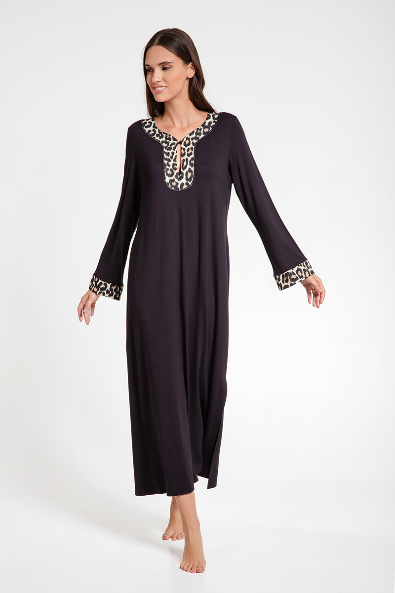 Μάξι μαύρο νυχτικό από βισκόζη ελαστάνη με λεοπάρ λεπτομέρειες.