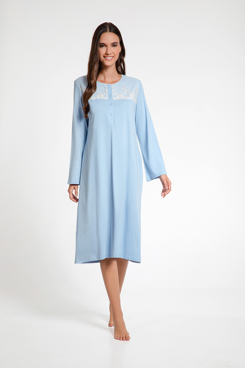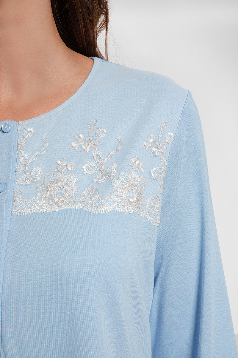 Απαλό γαλάζιο χρώμα με λεπτομέρεια δαντέλα στον γιακά.